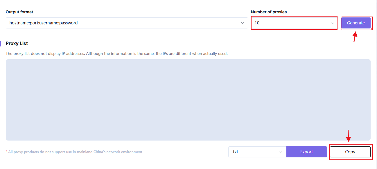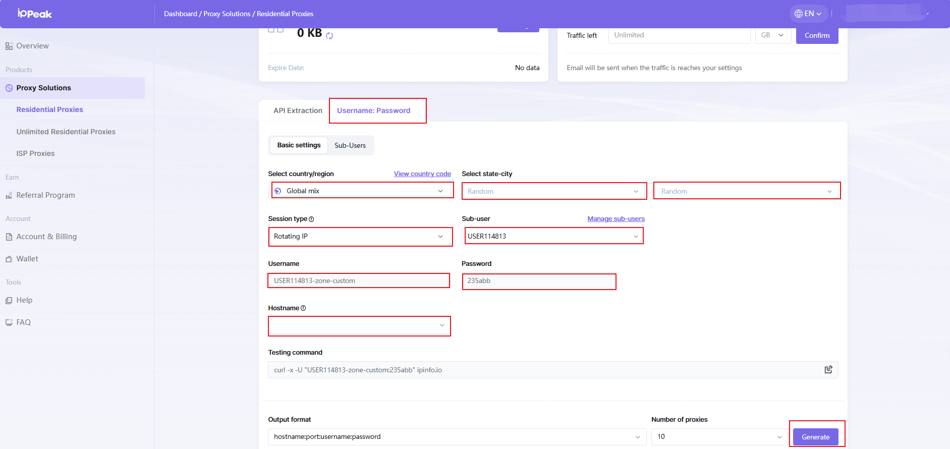 ● Port: Proxy Port (refer to the proxy information generated in IPPeak)